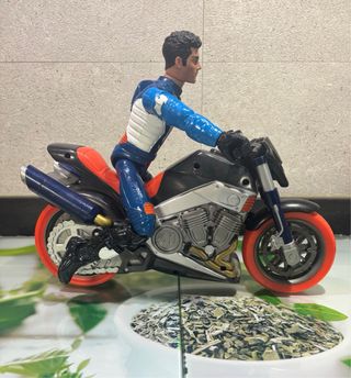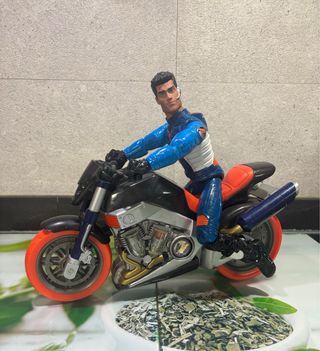 Muñeco de Action Man vestido de motorista, listo para la acción. - Figura articulada. - Incluye motocicleta. - Ropa de motorista detallada.