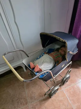 Coche de muñeca antiguo y muñeca Marta