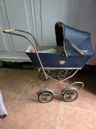 Conjunto de coche de muñeca antiguo y muñeca llamada Marta. Un clásico para coleccionistas o para revivir la nostalgia. - Coche de muñeca con capota azul y detalles metálicos. - Muñeca Marta con ropa de rayas y pantalón blanco. Con más de 55 años de antigüedad.