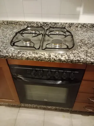 Conjunto de muebles de cocina con un diseño elegante y funcional. - Armarios superiores de madera con detalles en cristal. - Encimera de mármol con fregadero integrado. - Mueble inferior con horno y cajones. - cocina de gas incluida. - La L de cocina mide 2,20 x 1 metro. - Extractor de humos incluído. - Mueble auxiliar de 0,87 x 0,32 x 0,62 metros.