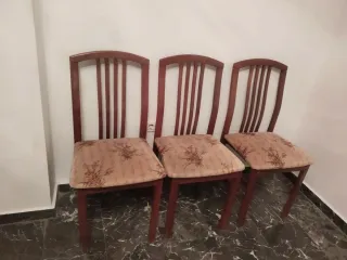 Conjunto de cuatro sillas de salón con un diseño clásico y elegante. Perfectas para dar un toque acogedor a tu comedor o sala de estar. - Tapicería con estampado floral en tonos beige y marrón. - Estructura de madera. - Respaldo con listones verticales. Las sillas las tiene que recoger en Mancha Real