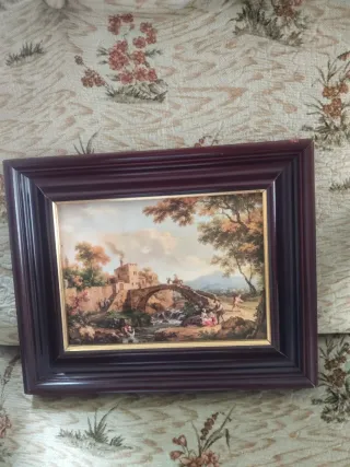 Conjunto de cuatro cuadros decorativos con un diseño clásico. Cada uno presenta un marco de madera y detalles en dorado, aportando un toque elegante a cualquier espacio. - Incluye cuatro piezas. - Marco con acabado en madera. - Detalles dorados en el interior del marco.Recoger de Mancha Real