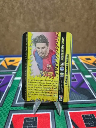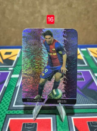 Cromo de fútbol de Lionel Messi de la colección Mundicromos 2008-09. - Fondo jaspeado y puntas redondas. - Edición: Revelación. - Jugador: Messi. - Temporada: 2008-09.