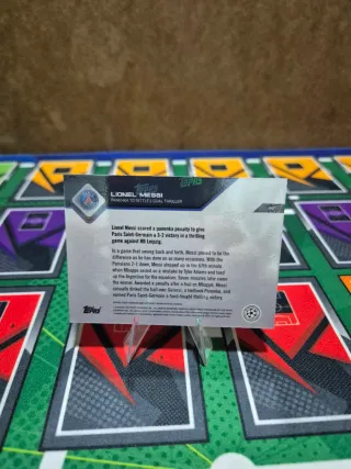Tarjeta de colección Topps Now de Lionel Messi. - Numerado: 14/99. - Edición Champions League. - Homenaje a su gol 'Panenka'.