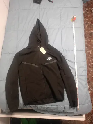 Conjunto deportivo Nike Tech de dos piezas. - Sudadera con capucha y cremallera completa. - Pantalón largo con cintura elástica y cordón. - Diseño moderno y cómodo.