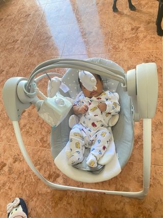 Hamaca para bebé en tonos grises. - Diseño acolchado para mayor comodidad. - Incluye varios juguetes colgantes. - Estructura resistente y segura.