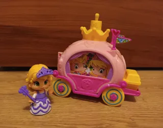 Set de juego Pinypon que incluye una carroza rosa con detalles dorados y un cofre amarillo. - Carroza con puertas que se abren. - Figura de Pinypon con vestido morado y varita. - Accesorios incluidos.