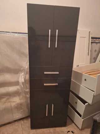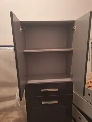 Armario auxiliar de diseño moderno, ideal para organizar tu baño o cualquier estancia. Prácticamente nuevo, se vende por mudanza - Acabado brillante. - Tiradores metálicos. - Combina colores gris y blanco.
