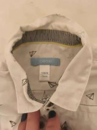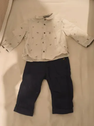Conjunto de camisa blanca con estampado de aviones de papel y pantalón azul marino. - Camisa de manga larga. - Cuello camisero. - Cierre de botones. - Pantalón con vuelta en el bajo. Conjunto de pantalón azul marino con detalles en marrón. La cintura es ajustable. La camisa es blanca con motivos marineros. Ideal para una ocasión especial. Usado sólo una vez para una comunión. En mi perfil están también los zapatos que llevó.