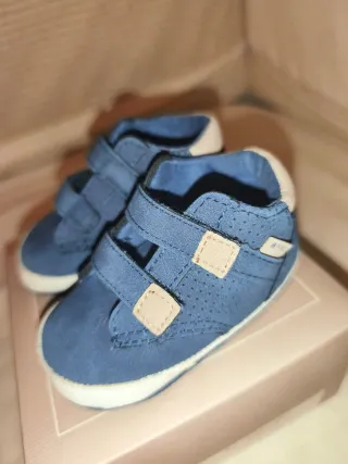 Preciosos zapatos para bebé de la marca Mayoral. - Color azul. - Cierre de velcro. - Talla 18. Zapatos blanditos en color azul marino con detalles en marrón. Los ha usado 1-2 veces cuando no andaba ni gateaba.