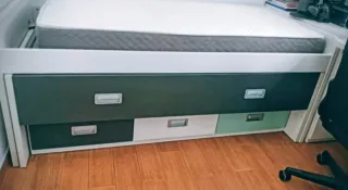 Cama nido con espacio de almacenamiento integrado. - Diseño moderno con armario y cajones. - Acabado en tonos verdes y blancos. -Cama 1,90 x 0.90 cm -Cama nido con 2 colchones (uno interno que se saca, convirtiéndose en cama doble) -Armario 2,18 alto, 0,45 ancho, 0,53 profundidad Muy bien conservado No se hacen envíos. Para recoger en Manises (Valencia)