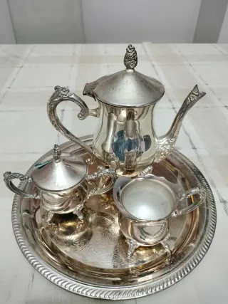 Elegante juego de té en acabado de plata. - Diseño clásico y detallado. - Incluye tetera, azucarero y lechera. - Bandeja decorativa.