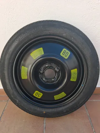 Rueda de repuesto tipo gallega de 17" Modelo: continental - Llanta de acero - Medidas: T135/80 R17 - Patron pernos: 5 tuercas - Etiqueta velocitat màxima 80km/h - Indicacion pression Max: 40 KPA ( 60 PSI) No se ha utilizado nunca
