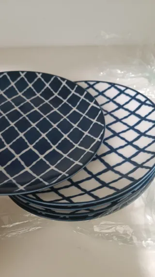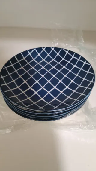 Conjunto de cuatro platos con un diseño de rombos en azul y blanco. Son perfectos para añadir un toque de estilo a tu mesa. - Diseño de rombos. Hay 5, 3 azules y 2 blancos - Diseño hondas. Son 2 platos hondos - Apto para lavavajillas. Todo incluido en el precio