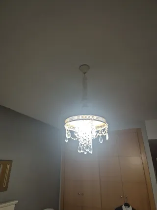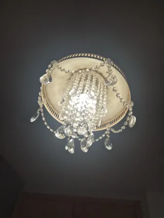 Elegante lámpara de techo con un diseño que combina metal dorado y cristales transparentes. Aporta un toque de brillo y sofisticación a cualquier estancia. - Estructura metálica con acabado dorado. - Colgantes de cristal tallado.