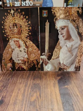 Conjunto de dos postales antiguas con imágenes religiosas. - Representan figuras con coronas y vestimentas ornamentadas. - Una de las postales incluye un escudo heráldico y una vela encendida.