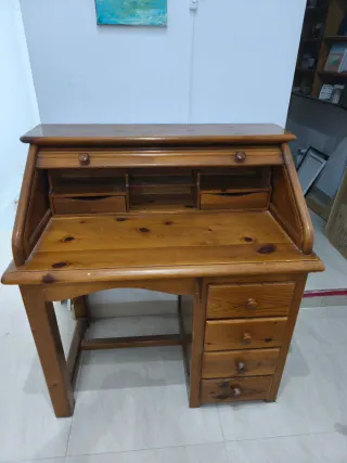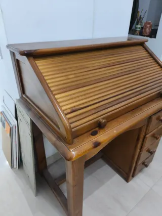 Elegante escritorio estilo provenzal, con un diseño clásico y funcional. Ideal para cualquier espacio, ideal para dormitorio niño/a, para ordenador y estudio. - Fabricado en madera maciza - Acabado en tono miel oscuro. - Con persiana y cajones