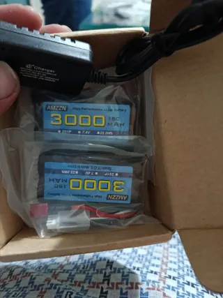 Se venden dos baterías de litio de alto rendimiento AMZZN. - Capacidad: 3000mAh - Voltaje: 7.4V - Configuración: 2S1P - Energía: 22.2Wh - Incluye cargador de pared.