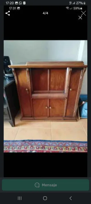 Elegante mueble vitrina con estructura de madera y puertas de cristal. El mueble tiene sus respectivos cajones. Base con compartimentos para botellas.