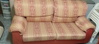 Sofá de tres plazas con un diseño clásico y cómodo. - Tapicería de tela con estampado. - Base en color rojo.