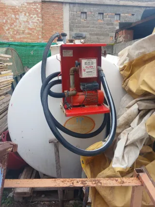 Depósito de gasoil blanco con bomba y contador. - Bomba eléctrica roja. - Contador digital. - Manguera de suministro.