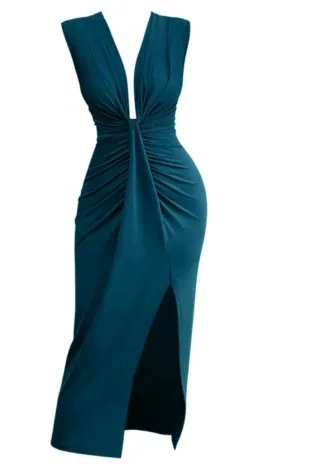 Elegante vestido midi de corte ajustado. Su diseño sin mangas lo hace perfecto para ocasiones especiales o para lucir un estilo sofisticado. Fruncido, abertura en la pierna, poliéster y elastano - Diseño sin mangas. - Largo midi. - Corte favorecedor.