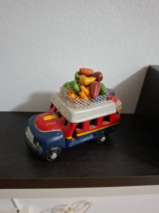 Adorno de guagua de la República Dominicana, con detalles de frutas y verduras en la parte superior. - Diseño colorido. - Representación de un vehículo típico. Cerámica