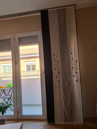 Conjunto de panel japonés con riel incluido. El panel tiene un diseño moderno y elegante. Incluye Riel de aluminio para colgar el panel y todos sus accesorios. Medidas del ventanal 290 de ancho, el panel lo cubre perfectamente. A recoger en Rafelbunyol