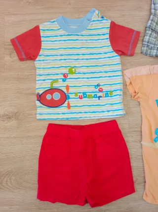 Conjunto de ropa de verano para bebé de 1 año. - Camiseta a rayas con estampado de submarino. - Pantalón corto rojo. Tex. - Pantalón corto de cuadros verde y blanco. Benetton. - Pelele naranja con estampado de dinosaurio y texto Baby Dino. Tex . Más cositas en mi perfil. Hago lotes. Siempre subiendo cosas. Sígueme!