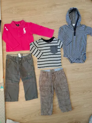 Lote de ropa para bebé niño de 12 a 18 meses. Incluye varias prendas para diferentes ocasiones. - Polo rosa con detalle de caballo blanco. Ralph Lauren. - Camiseta de rayas grises y negras con bolsillo. Primark - Body de rayas azules y blancas con capucha. Unknown. - Pantalón cargo gris. Zara. - Pantalón de pana a cuadros marrón. Zara. Más cositas en mi perfil. Hago lotes. Siempre subiendo cosas. Sígueme!