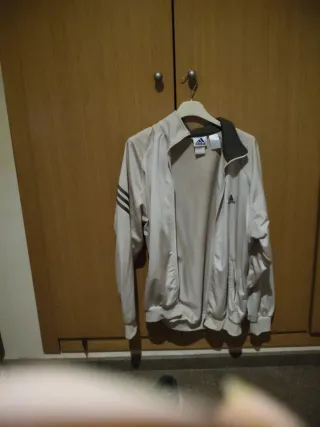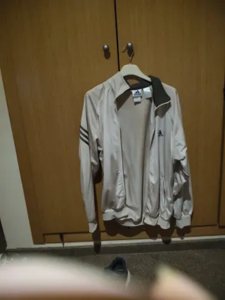 Sudadera deportiva Adidas en color beige. Presenta el diseño clásico de la marca. - Tres rayas características en la manga. - Logo de Adidas en el pecho.