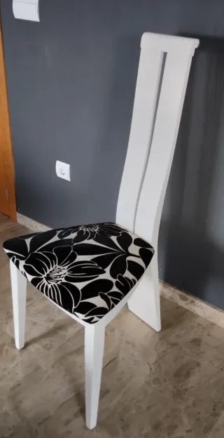 Conjunto de 6 sillas de Haya para comedor con un diseño moderno y elegante. -Para restaurar ,tal como se ve en las fotos - Patas y estructura en color blanco. - Asiento tapizado con estampado floral en blanco y negro.