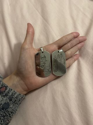 Set de dos llaveros con grabados personalizados. - Un llavero con la imagen de un hombre y un perro. - Otro llavero con la imagen de una familia.