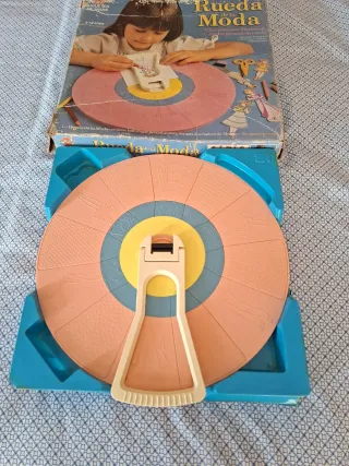 Juego Rueda de la Moda de los años 80, ideal para niñas de 6 a 12 años. Permite crear diseños de moda girando la rueda. - Incluye la rueda principal con diferentes secciones de diseño. - Contiene piezas para crear modelos de ropa. - Caja original con ilustraciones de la época.