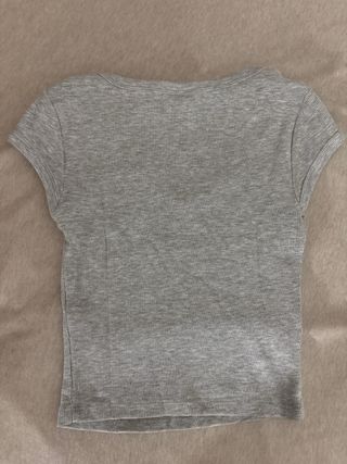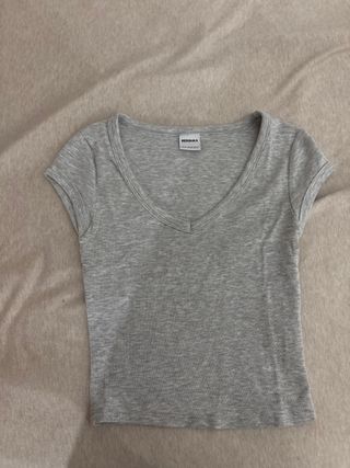 Top de Bershka en color gris. Es un básico de armario con un diseño de cuello en pico y manga corta. - Tejido acanalado. - Corte ajustado.