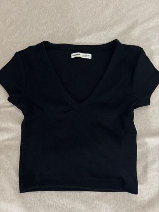 Top negro de Pull&Bear con un diseño moderno y favorecedor. - Tejido acanalado. - Corte cropped. - Cuello en V pronunciado.