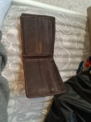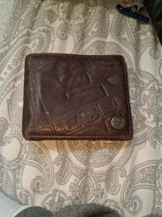 Cartera de piel marrón de la marca Diesel. Presenta un diseño con el logo grabado en relieve y un detalle metálico. - Material: Piel - Color: Marrón - Marca: Diesel