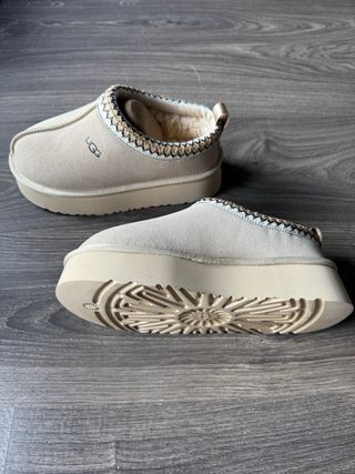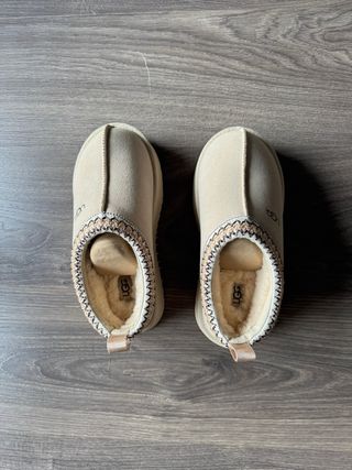 Pantuflas UGG Tazz II en color beige. - Exterior de ante. - Forro interior de lana. - Detalle de borde trenzado. - Tirador trasero.