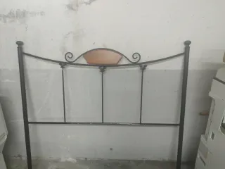 Cabecero de forja con detalles en madera. Su diseño combina la robustez del metal con la calidez de la madera, aportando un toque elegante a tu dormitorio. - Estructura principal de metal. - Detalle central de madera con forma curva.