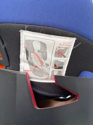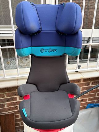 Silla de coche Cybex con sistema Isofix. Diseñada para la seguridad y comodidad. - Color azul y negro. - Detalles en color turquesa. - Reposacabezas ajustable. - Funda extraíble. - se puede usar con alzador