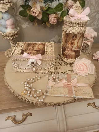 Elegante conjunto de estilo vintage, perfecto para organizar tus pequeños tesoros. - Joyero decorado con detalles ornamentales. - Frasco de almacenaje a juego con diseño floral. - Adornos de lazos y perlas.
