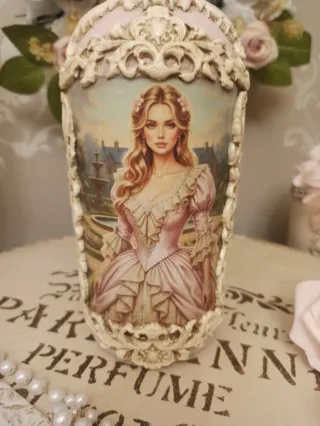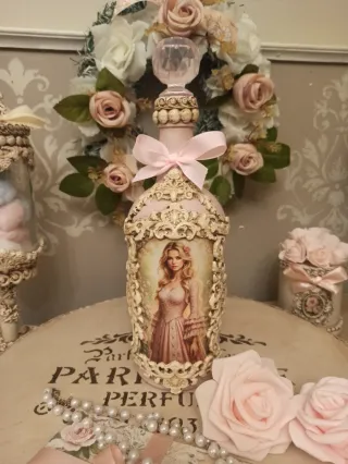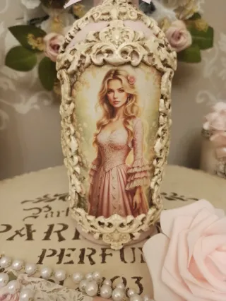 Elegante botella decorada con un diseño vintage y un tapón joya. - Adorno de encaje y figura de dama. - Detalle de lazo rosa. - Acabado en color rosa pálido.