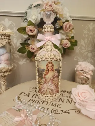 Conjunto de artículos decorativos estilo vintage. - Botella de perfume decorada con imagen de época. - Adorno con lazo y corazón. - Perlas decorativas. - Elementos de encaje y flores.