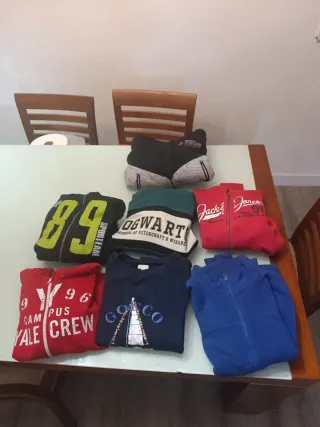 Conjunto de ropa para niños de 10 a 12 años. - Sudadera negra y gris con cremallera. - Sudadera verde y negra con estampado 'Hogwarts'. - Chaqueta roja con cremallera 'Jack & Jones'. - Sudadera roja con cremallera 'Campus Royale Crew'. - Camiseta azul marino con estampado 'Gocco'. - Chaqueta azul con cremallera.