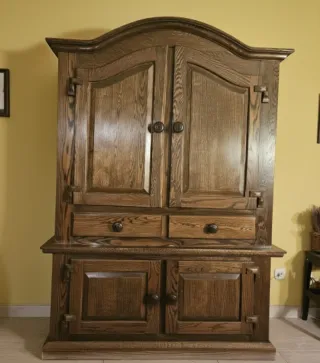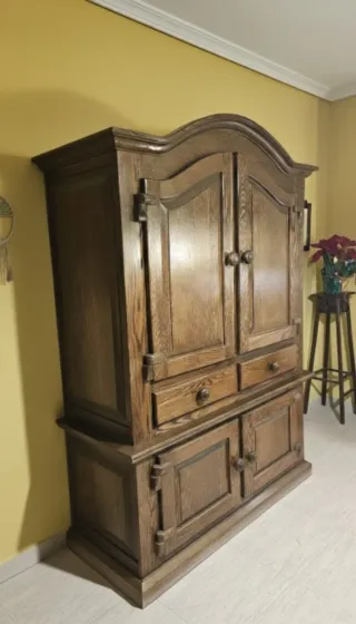 Mueble de salón con un encantador estilo rústico. Sus acabados en madera de roble le dan un toque cálido y acogedor. - Diseño de puertas y cajones. - Detalles decorativos en los laterales. - Medidas: Anchura 130 (142 voladizo) Fondo 52 (58 voladizo) Altura 195 (180 parte baja)