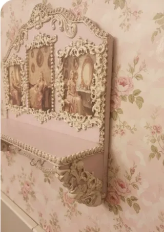 Elegante estante expositor con un diseño vintage y romántico, perfecto para exhibir tus perfumes o joyas. - Marco superior con tres camafeos. - Estante principal en color rosa pálido. - Ganchos inferiores para colgar collares o pulseras.