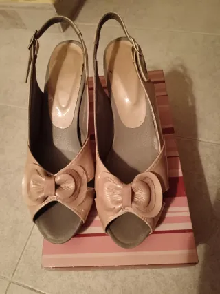Sandalias de mujer con un diseño elegante y un lazo decorativo. Puesto muy poco Tacon de alto mide 9cm - Color beige y rosa. - Talla 40.