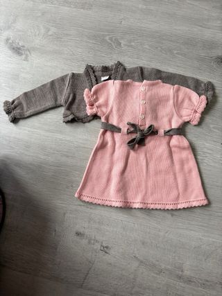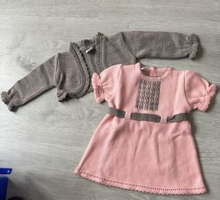 Conjunto de dos piezas para bebé, ideal para ocasiones especiales. Marca Mac Ilusion - Vestido de punto rosa con detalles en gris/marron. - Rebeca de punto a juego. - Acabado con puntilla en mangas y bajo.