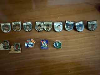 Conjunto de pines antiguos del Real Madrid, con retratos de jugadores. - Pines de jugadores como Butragueño, Milla, Alfonso, Hierro, Sanchís, M. Vázquez, Zamorano, Buyo, Michel y Q. Flores. - Incluye también insignias del club.