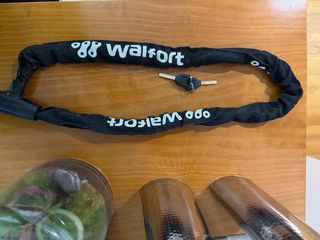 Candado de cadena resistente para asegurar tus pertenencias. - Incluye dos llaves. - Cubierta de tela negra.